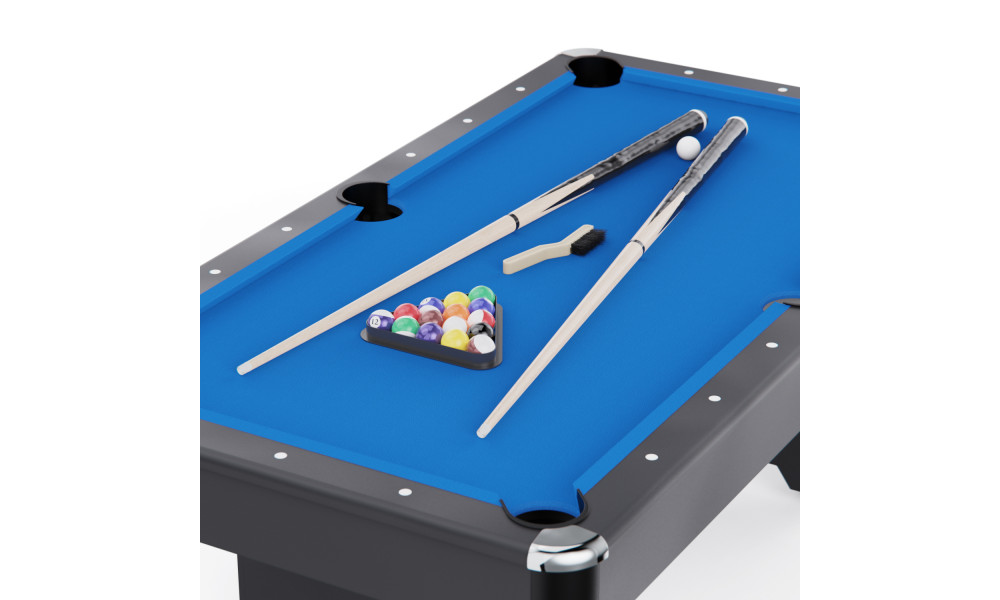 Всё, что нужно для начала — уже включено: комплект бильярдных шаров диаметром 57 мм, два кия длиной 144,8 см, треугольник для выравнивания, щётка для ухода за покрытием и два мелка.